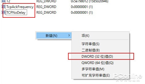 4. 在包含有“DhcpIPAddress”的子项下,分别建立两个DWORD(32)值,依次命名为“TcpAckFrequency”和“TCPNoDelay”,键值全部设为“1”。注意!包含“DhcpIPAddress”的子项可能不只一个,所有的都要添加;